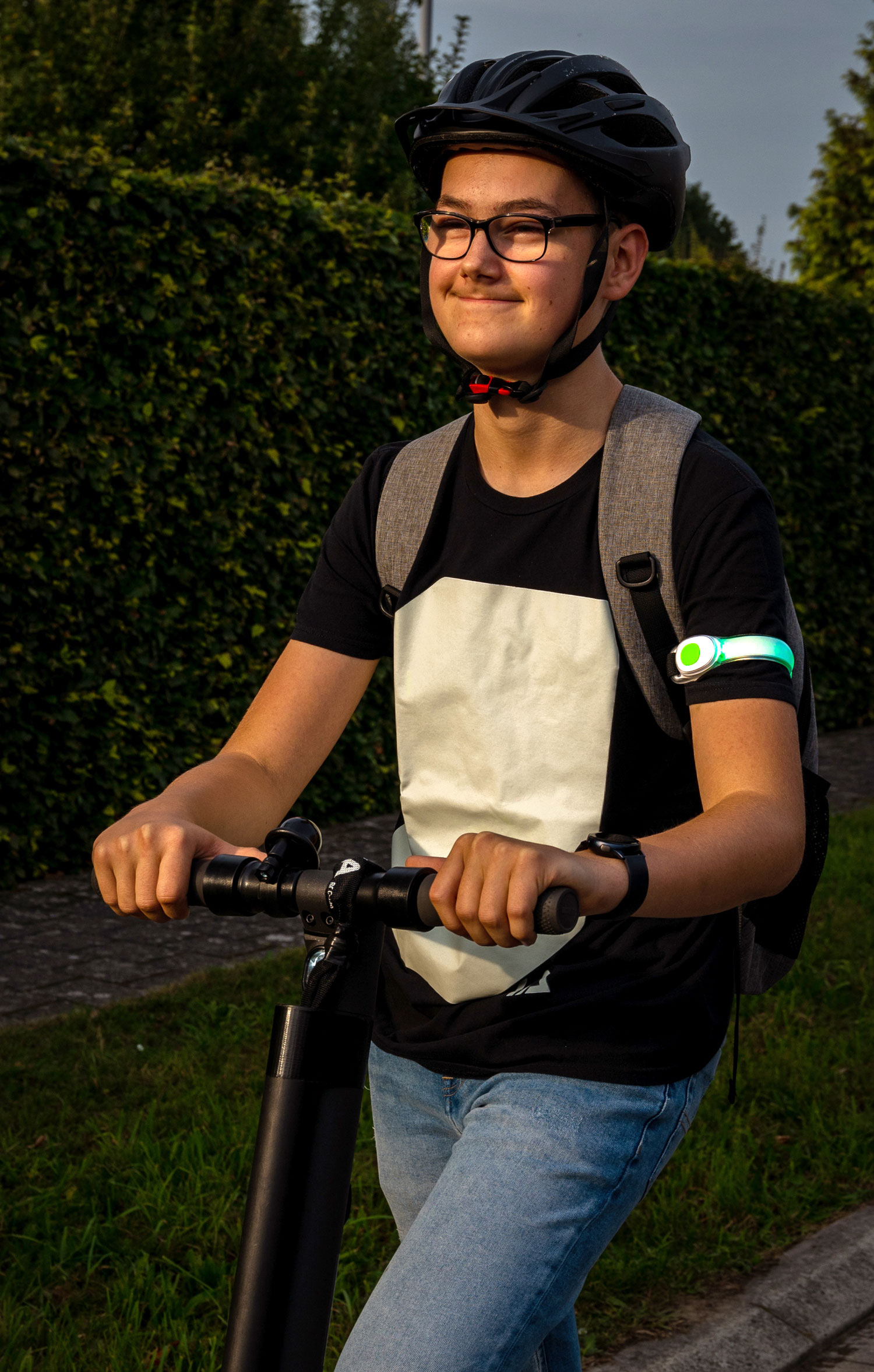 Met een fluohesje in het donker ben je gezien als er verlichting op schijnt, met onze veiligheidsband ben je ALTIJD gezien!